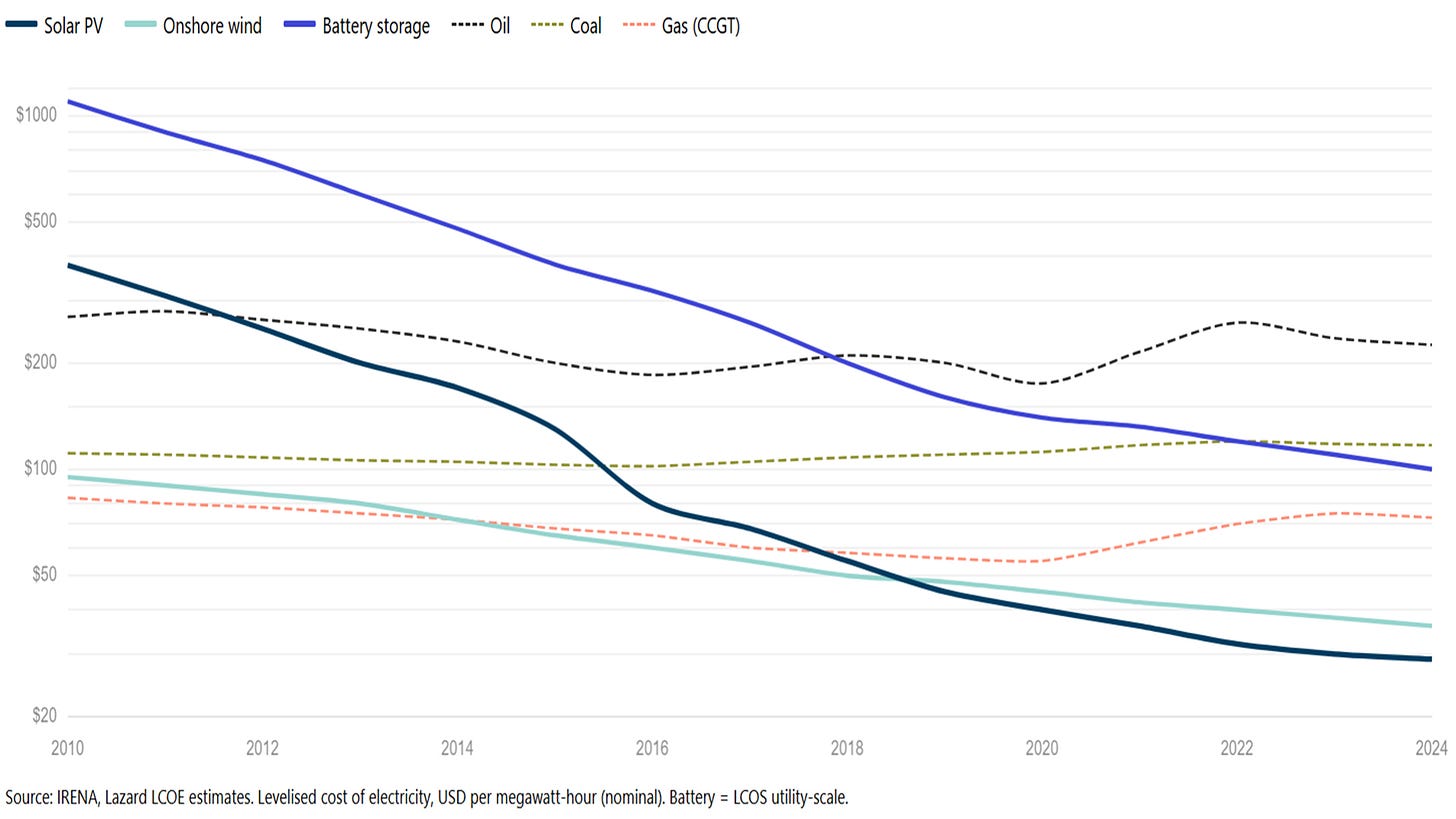 Rick will buy whatever is cheapest. If diesel generators were cheaper than batteries tomorrow, he’d buy a diesel generator. The 1970s oil shocks made Americans buy small cars. Cheap oil brought back the SUV. This time the cost curve has moved too far to snap back. Electric vehicles are approaching purchase-price parity with combustion engines. Battery storage costs have dropped roughly 90 percent in fifteen years. Solar electricity has fallen from $378 per megawatt-hour in 2010 to under $30 today. Once Rick installs that battery, he won’t uninstall it when petrol falls back to a buck sixty.